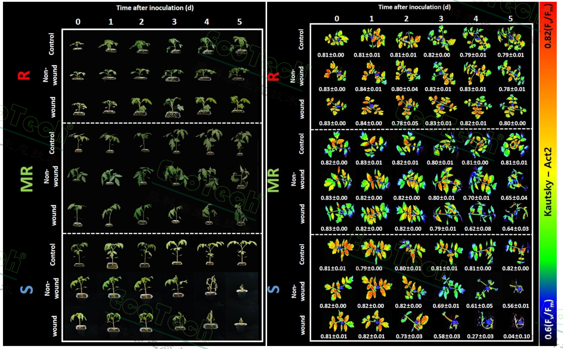 番茄青枯病由青枯病菌(Ralstonia solanacearum)引起,嚴重影響番茄幼苗和果實生產(chǎn)。為了有效管理和減少該病的傳播,需要進行監(jiān)測和早期檢測。在韓國全州國立大學(xué)的Kim等人發(fā)表的一項研究中,對溫室條件下種植的30個不同青枯病抗性的番茄品種幼苗進行青枯病菌接種,接種采用傷口接種法(Wound)和非傷口接種法(non-Wound)。使用FluorCam葉綠素?zé)晒獬上裣到y(tǒng)監(jiān)測對照及接種幼苗接種5天后(dpi)的光合變化,以及統(tǒng)計16dpi的視覺疾病指數(shù)(DI)。