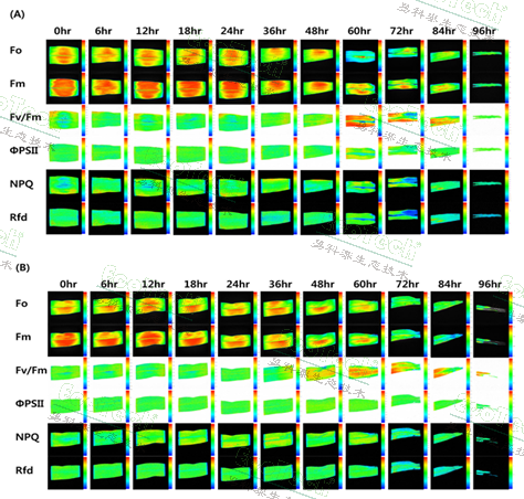 實(shí)驗(yàn)中選擇了耐熱品種Kwangpyeongok作為對(duì)照組、熱脅迫品種Ilmichal作為實(shí)驗(yàn)組將兩個(gè)品種的玉米幼苗在 35±2°C、相對(duì)濕度 35% 的生長(zhǎng)箱中,經(jīng) 96 小時(shí)熱風(fēng)處理后,檢測(cè)其葉綠素?zé)晒獬上駞?shù)值(Fo、Fm、Fv/Fm、ΦPSII、NPQ 和 Rfd),并進(jìn)行比較分析。