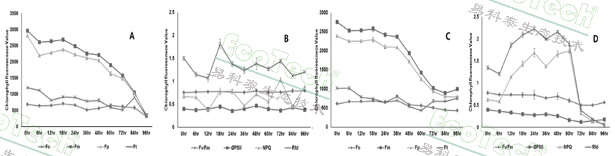 生長(zhǎng) 96 小時(shí)的玉米幼苗的葉綠素?zé)晒獬上駞?shù)變化的比較。對(duì) Fo、Fm、Fp 和 Ft(3A 和 C)以及 Fv/Fm、ΦPSII、NPQ 和 Rfd(3B 和 D)的比較分析。