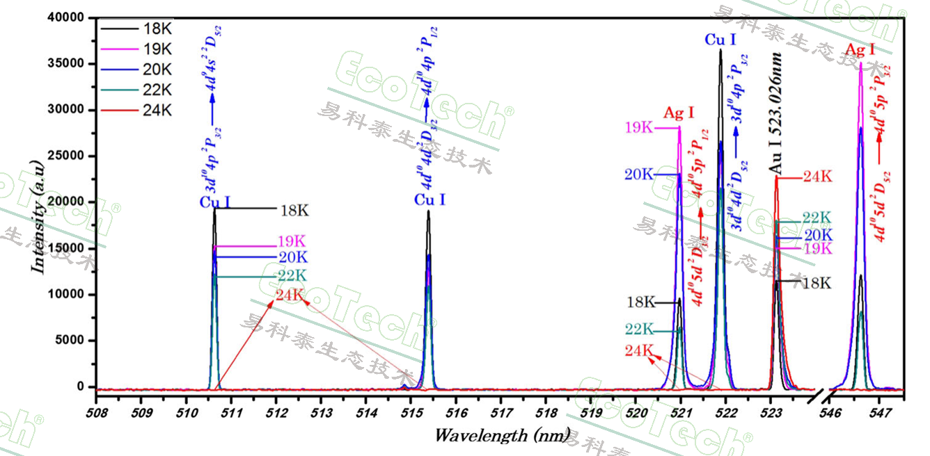 巴基斯坦國(guó)家物理中心(Ahmed N,2018)利用激光誘導(dǎo)擊穿光譜技術(shù)分析18K、19K、20K、22K、24K 黃金的元素組成。隨著K金含量的上升,銅、銀雜質(zhì)逐漸降低,實(shí)現(xiàn)了18K至24K金合金的快速、非破壞性、無(wú)需預(yù)校準(zhǔn)的精準(zhǔn)成分分析,檢出限低至0.05ppm(Au),滿(mǎn)足國(guó)際黃金標(biāo)準(zhǔn)認(rèn)證需求。